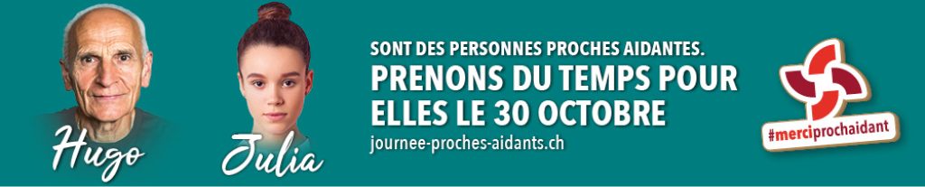 Organisée chaque année le 30 octobre, la Journée des proches aidant·e·s a pour objectif de rendre visible la contribution essentielle des proches aidant·e·s à notre société. Ces personnes consacrent du temps à aider un·e proche atteint·e dans sa santé et/ou son autonomie. Cette journée est l’occasion de leur dire « « Merci ! ». Chacun·e est invité·e à faire un geste aux personnes proches aidantes de son entourage : www.journee-proches-aidants.ch/soutenir-un-proche-aidant
